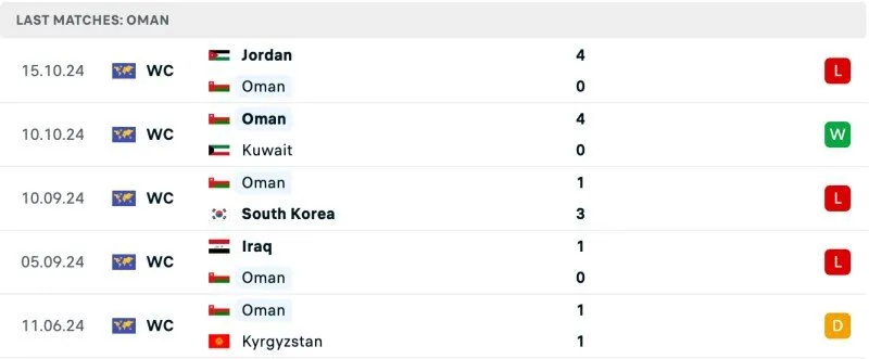 Trong bốn trận đấu vòng loại World Cup gần đây, Oman chỉ giành được một chiến thắng trước Kuwait và đã phải chấp nhận thất bại trong các trận đấu với Jordan, Hàn Quốc và Iraq. Điều này phản ánh sự không ổn định trong lối chơi và cho thấy Oman vẫn còn thiếu sức mạnh để nổi bật trong một bảng đấu đầy thử thách này. Tuy nhiên, cuộc đối đầu sắp tới với Palestine có thể là cơ hội để Oman tái lập niềm tin.